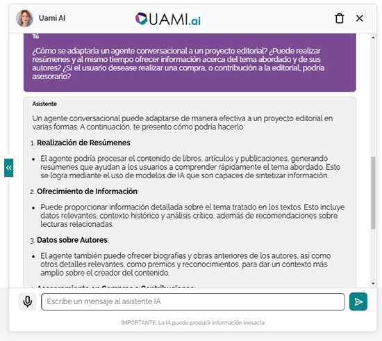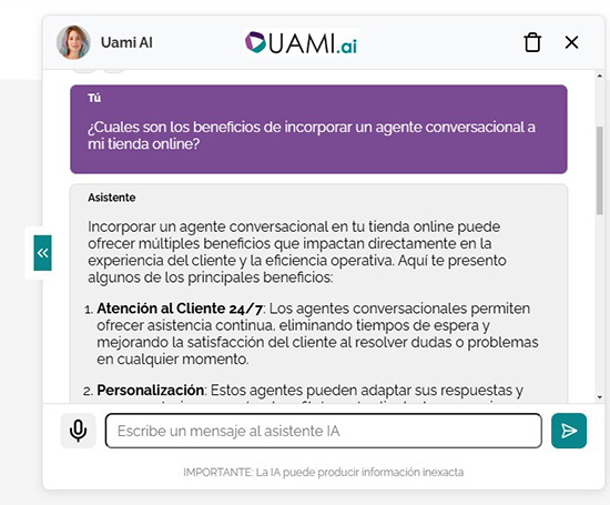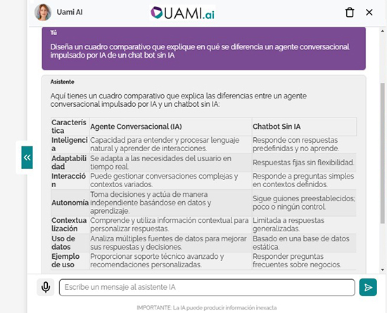 Los agentes conversacionales de UAMI tienen la capacidad de entablar conversaciones complejas al poder abordar inquietudes más elaboradas, realizar seguimientos sobre temas debatidos previamente y ajustar su tono y enfoque según el contexto de la conversación. Esto asegura que cada conversación no sea únicamente informativa, sino también enfocada en lo que busca el cliente, lo que resulta en una mejora de la experiencia general del usuario.